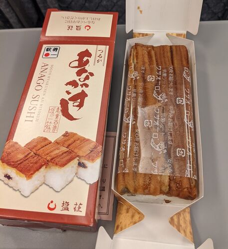 敦賀出張のときに特急しらさぎの中で帰りに食べてた穴子寿司です。駅では他にも色々お弁当が売っていたんだけど、ちょっと出遅れてお店が閉まってたので、コンビニの隣のお土産物屋で売れ残っていたこれになりました。あなごもしっかりたっぷりだけど、押し…