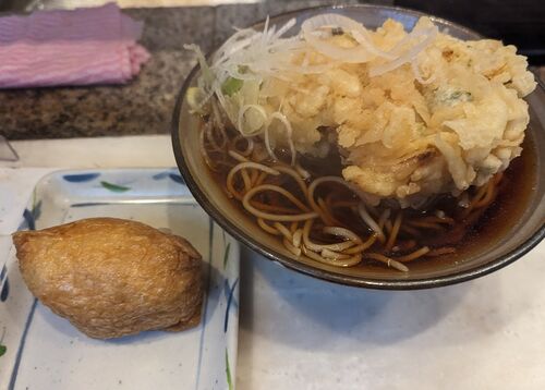 新宿かめやさんの天ぷらそばといなり寿司です。いなり寿司は夜に行くとだいたい売り切れなのでちょっとレア物?この日は午前中にお店に行ったのでまだまだたくさんありました。普段天ぷらをダブルにするんだけどいなり寿司があるので天ぷら一つ。 五目いなり…